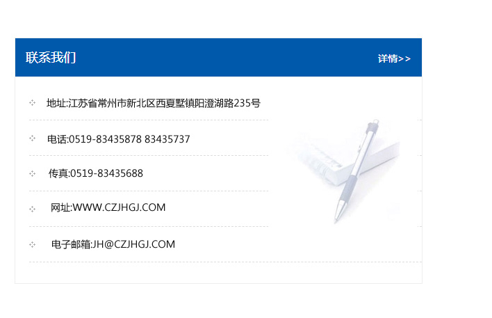 地址:常州市新北區(qū)友邦商務(wù)大廈1幢16、17層  電話:0519-85101652  傳真:0519-85112595  郵編:213022  網(wǎng)址:www_cz-jiayue_cn.jiexianduanzitai.com  郵箱:xiajifengaa@163.com